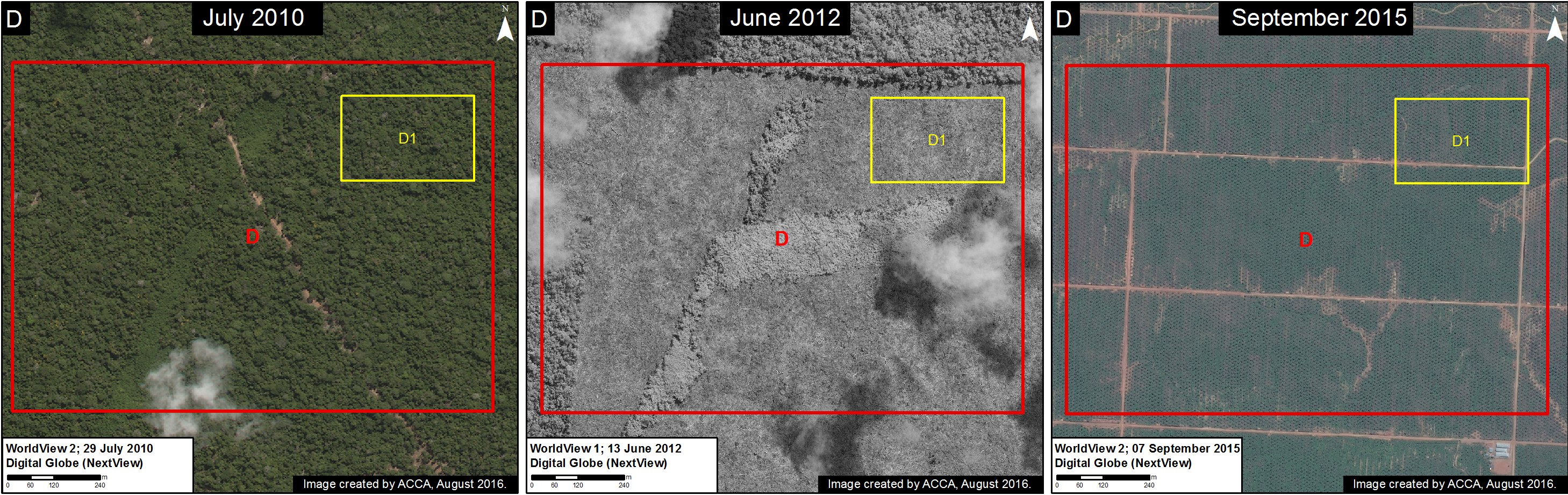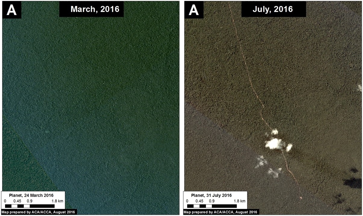 Below, we show high-resolution satellite images of the recent deforestation in all three threatened sectors. Click each image to enlarge.