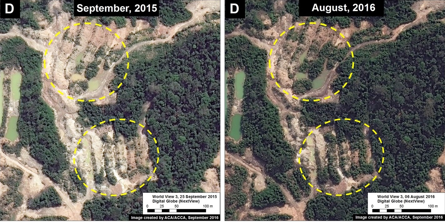 Images 45g-h show recently deforested areas (indicated by yellow circles) between 2015 (left panel) and 2016 (right panel). These areas have been the target of recent government interventions; note that within the red circles the mining machinery has been eliminated between August and September 2016.