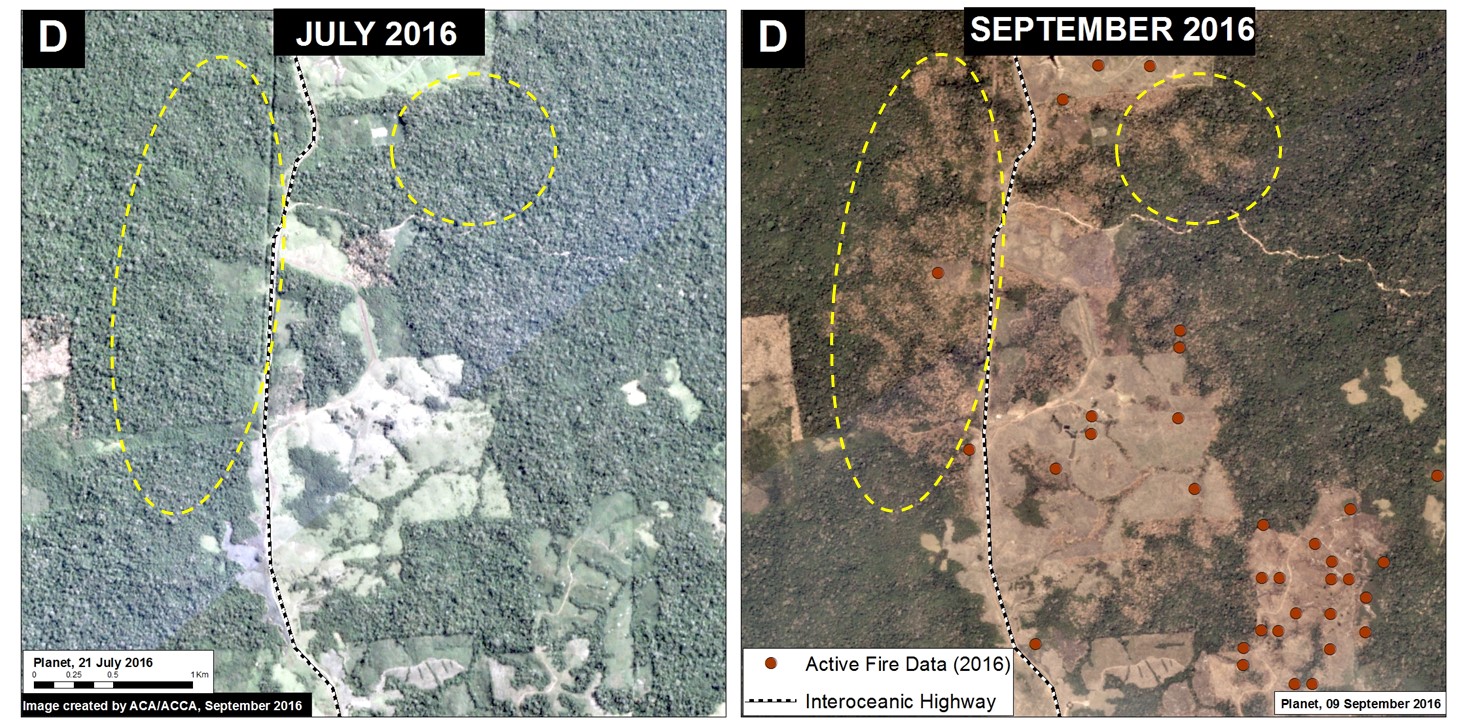 Image 45e shows examples of deforestation between September 2015 (left panel) and August/September 2016 (right panel). The
