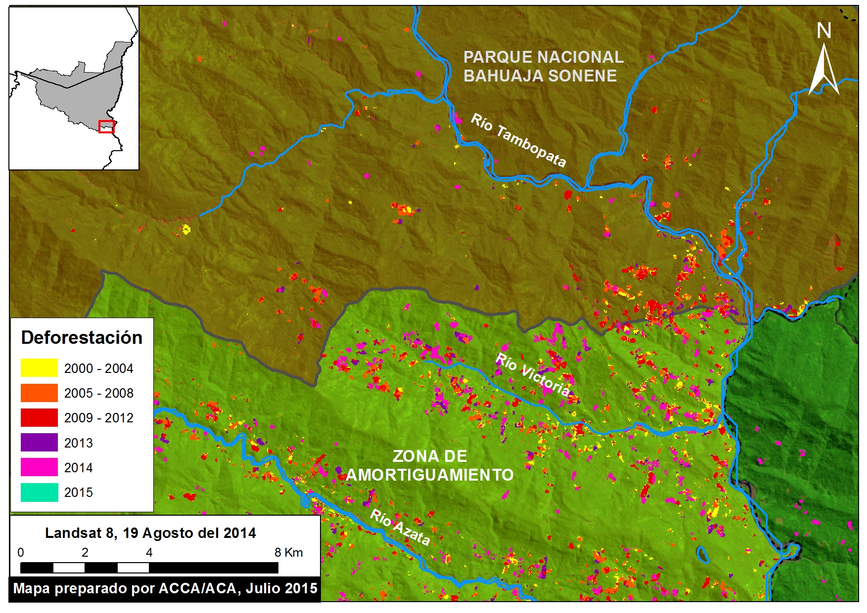 Nuestras estimaciones en este sector muestran que desde 2001 se han deforestado 538 hectáreas al interior del Parque y una aproximadamente 1,172 ha en la zona de amortiguamiento contigua. Al igual que el sector Loromayo, hubo un notable incremento de la deforestación desde 2010 con un valor máximo en el 2014. Más de la mitad de la deforestación (53%, 287 ha) al interior de este sector del Parque ocurrió desde 2010, con un máximo de 81 ha en 2014.