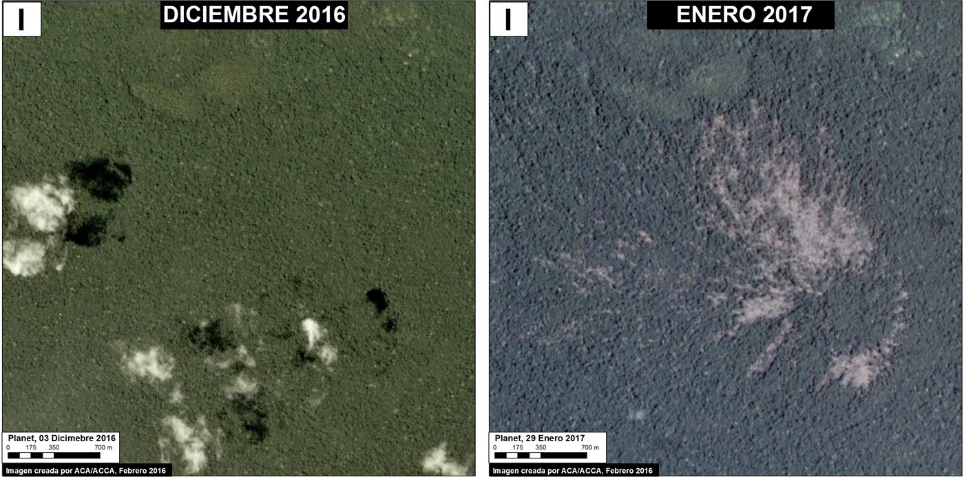 En enero del 2017, las alertas GLAD indicaron dos nuevos eventos de vientos huracanados, en la región Madre de Dios. A continuación, mostramos imágenes de alta resolución de estos dos casos. Lo primero es un evento grande, con una pérdida de 317 hectáreas (equivalente a 434 campos de fútbol) (Imagen 55a). El segundo es un evento de 75 hectáreas (101 campos de fútbol) que ocurrió al interior de una concesión forestal (Imagen 55b).