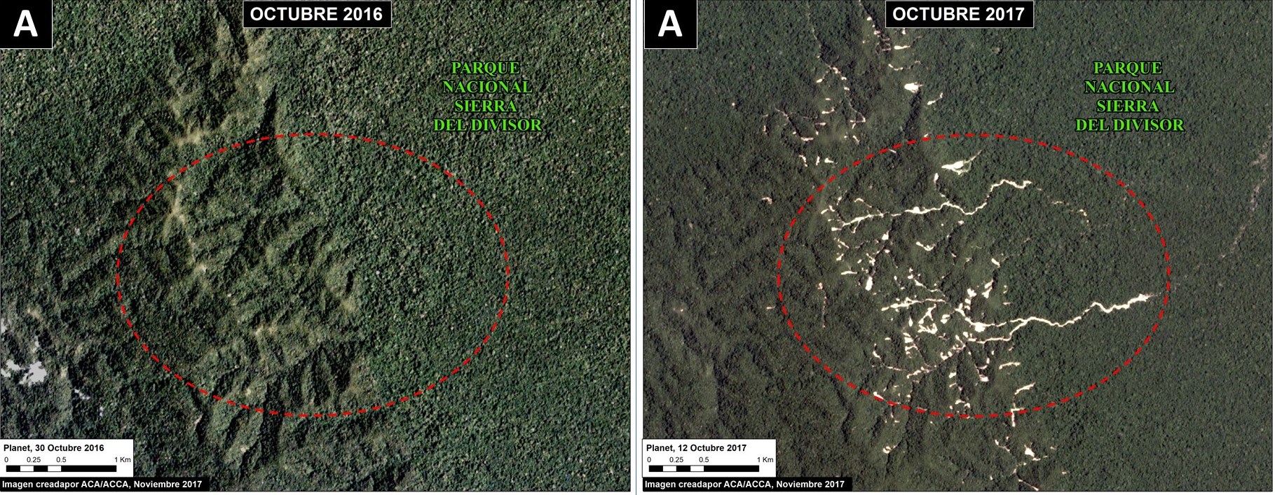 La Imagen 74a muestra unos derrumbes al interior del Parque Nacional Sierra del Divisor entre octubre del 2016 (panel izquierdo) y octubre del 2017 (panel derecho). La pérdida natural es de 30 hectáreas.