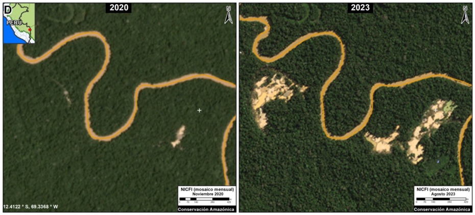 Sin embargo, un análisis más detallado que utiliza imágenes de muy alta resolución (0.5 metros) muestra un significativo incremento de infraestructuras mineras y la actividad minera en áreas previamente deforestadas por la minería ilegal, las cuales habían sido recuperadas por el gobierno peruano tras la Operación Mercurio.