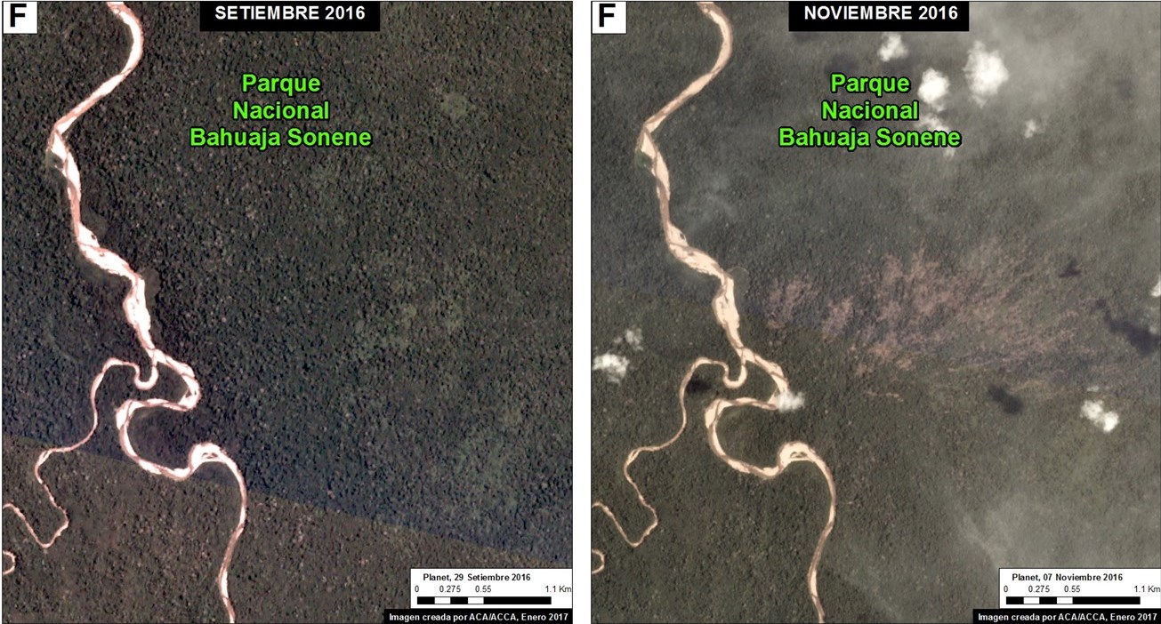 Desde el 2017, ACCA está trabajando en un proyecto, financiado por la Agencia Noruega para la Cooperación al Desarrollo (NORAD), para mejorar el monitoreo de las concesiones forestales de la asociación local ACOMAT (Asociación de Concesionarios Forestales Maderables y no Maderables de las Provincias del Manu y Tambopata). Las siguientes imágenes muestran ejemplos de: tala ilegal, ganadería, pérdida natural (vientos huracanados), y minería aurífera.